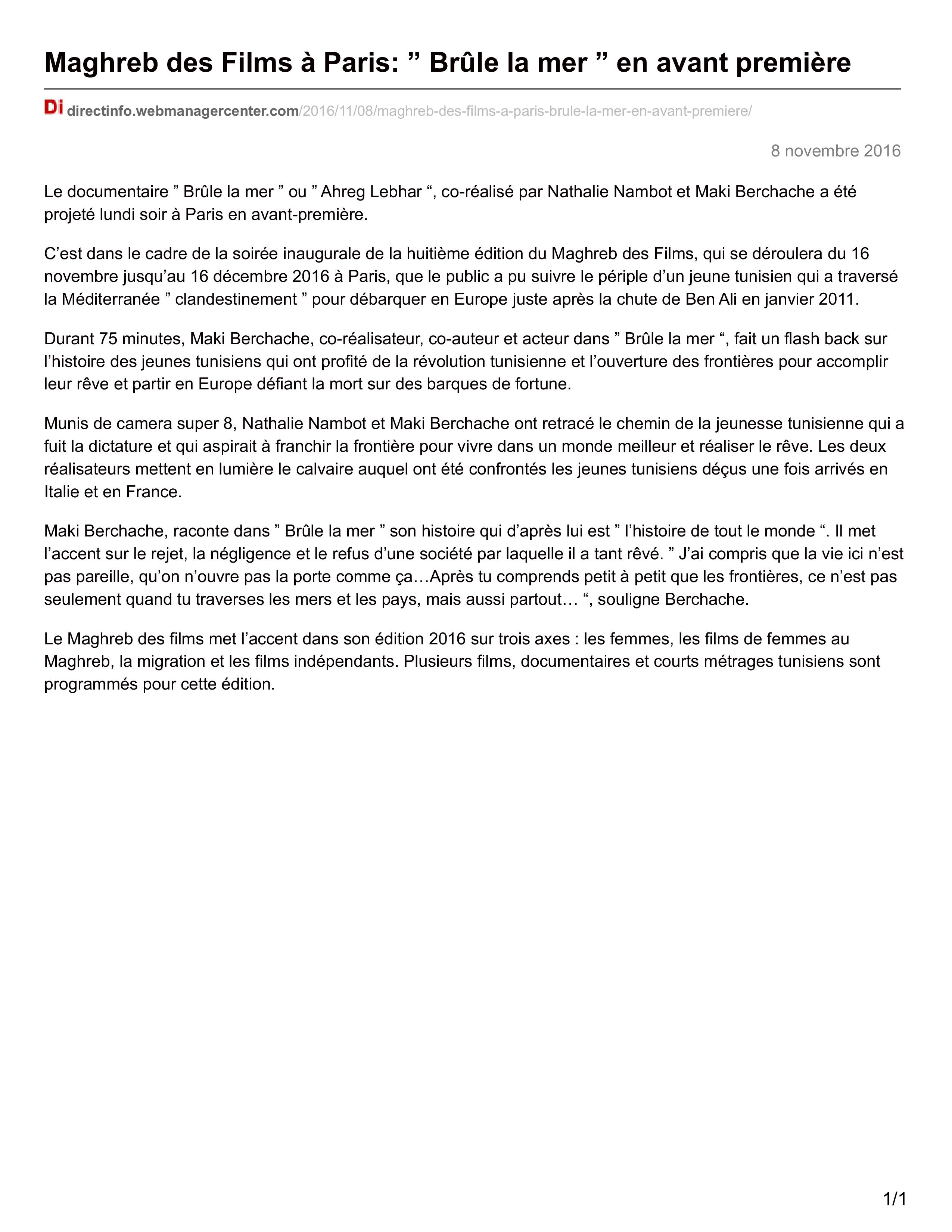 En 2011, grâce à la révolution qui renverse Ben Ali, ils réussissent à quitter leur patrie mal-aimée, mal-aimante, où l’avenir leur est confisqué. Mais pour ces jeunes Tunisiens, la France, pays d’adoption pas si tendre exigeant des papiers de toutes sortes pour le moindre droit, sera finalement moins aimée encore que leur terre d’origine... C’est le constat désabusé que ce documentaire livre comme un cri du coeur. Le seul espoir, dit un jeune homme, est désormais dans la religion, la foi. Cela mériterait une discussion, qui, hélas, fait défaut. Mais, sur l’écran, l’amertume se raconte à travers une belle délicatesse cinématographique, des images qui disent le sentiment par-delà le ressentiment. — Frédéric Straus _ TELERAMA