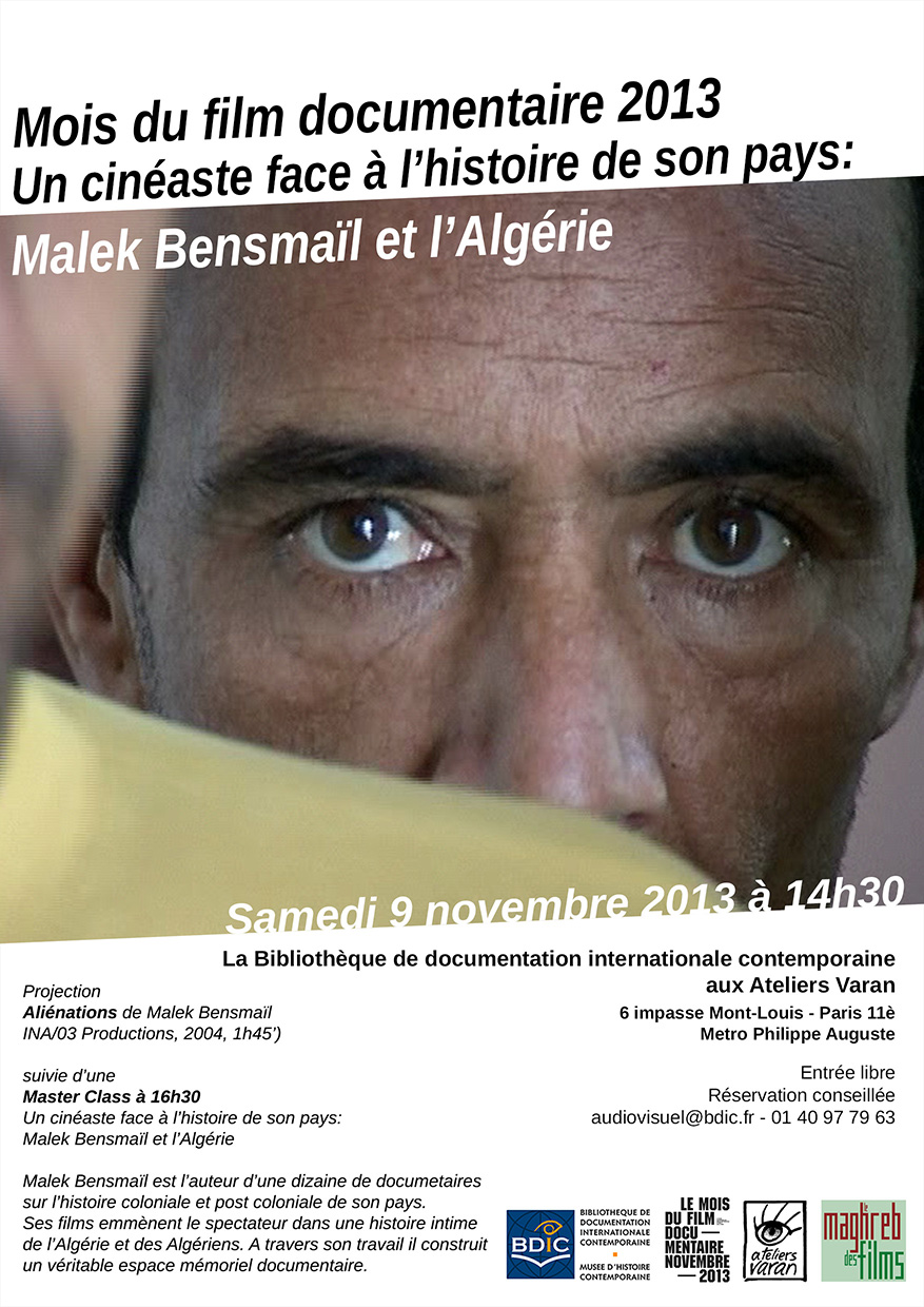 Dans le cadre du Mois du film documentaire, la Bibliothèque de documentation internationale contemporaine (BDIC) organise en partenariat avec le Maghreb des films et les Ateliers Varan une séance de projection et Master Class « Un réalisateur face à l’histoire : Malek Bensmaïl et l’Algérie » au cours de laquelle sera projeté Aliénations.